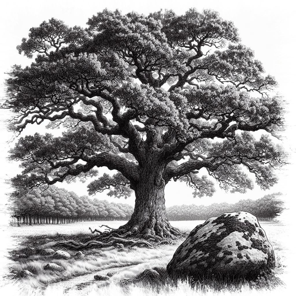 De magische boom in het bos met de witte steen waar een spreuk in staat.